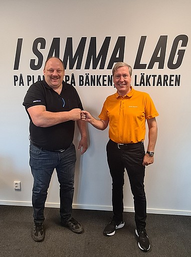 På bilden ser vi Jörgen hälsa Per Lundahl välkommen med en numera klassisk Corona-hälsning.